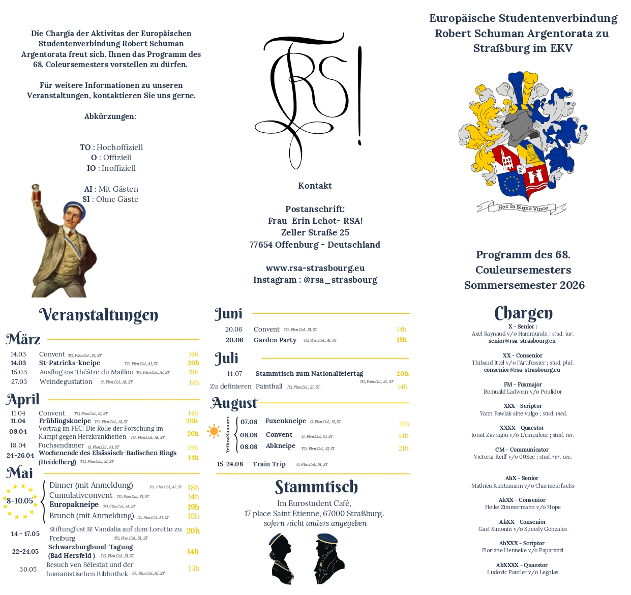 Hier ist unser Programm, das die Veranstaltungen des laufenden und des kommenden Semesters festhält, seien es die traditionellen Kneipenabende, die internen Treffen (Convent) oder andere.