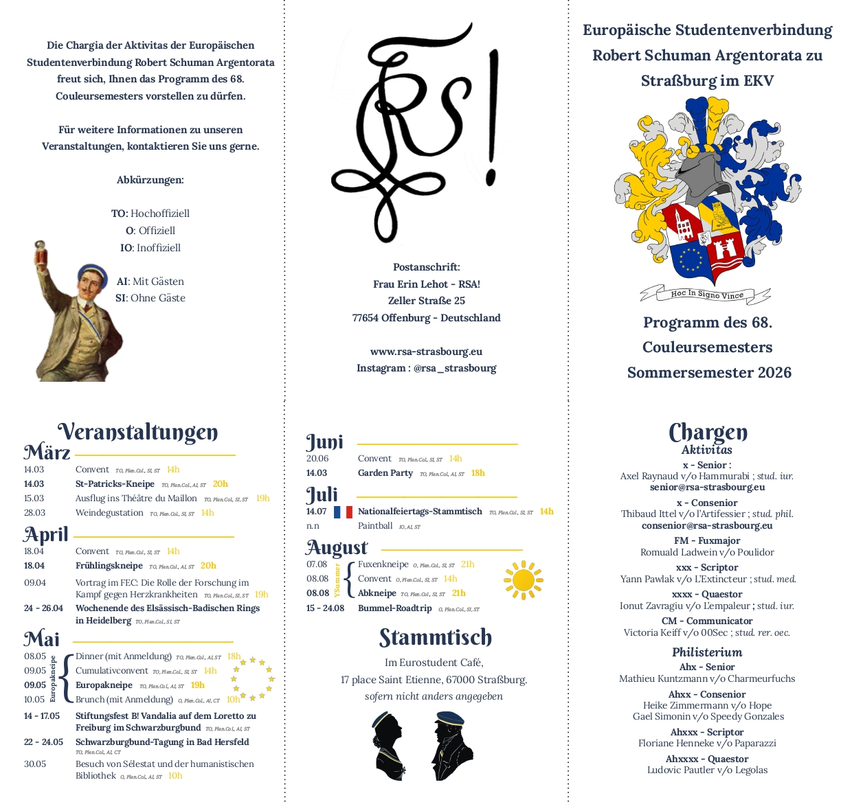 Hier ist unser Programm, das die Veranstaltungen des laufenden und des kommenden Semesters festhält, seien es die traditionellen Kneipenabende, die internen Treffen (Convent) oder andere.